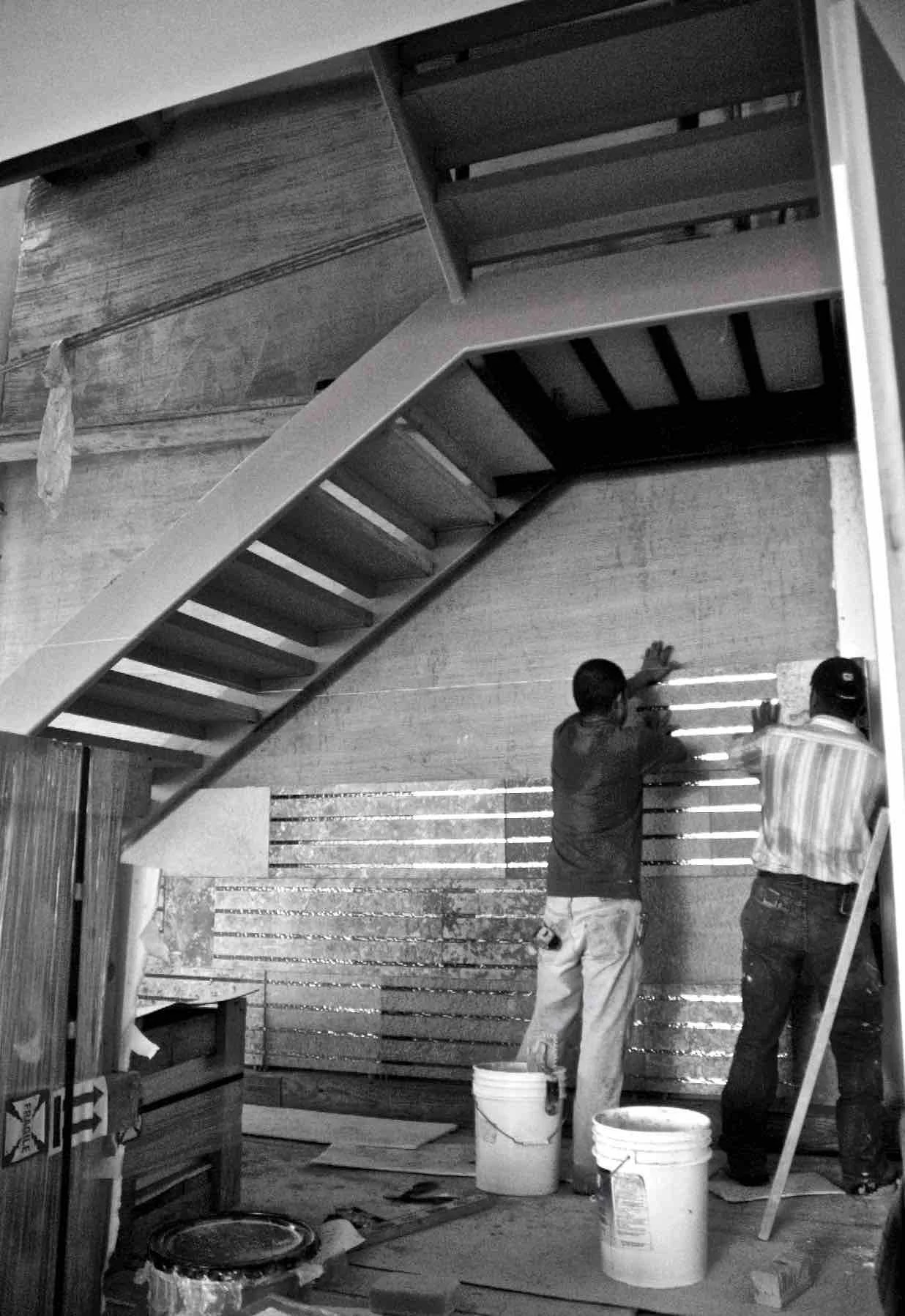 The top three floors of a High Rise condominium in downtown Dallas, had not been built out for decades since the structure had been completed. The new owner secured the raw properties and sought ideas that conceptually and physically unite the three floors. The Artists response was to install a contiguous wall work 38 foot high by 18 foot wide with a detached staircase "floating" in the foreground.