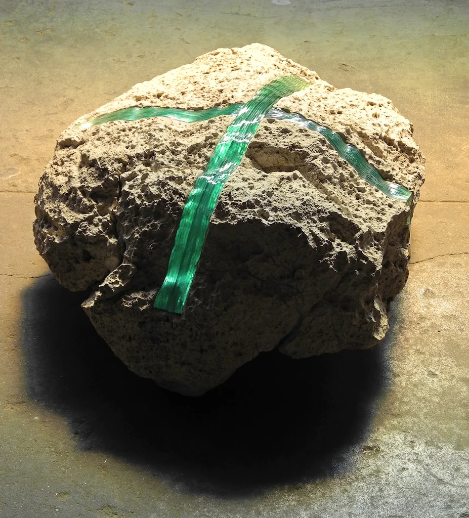 Monoliths are a very early series of sculptures that take a single stone and saw it as a loaf of bread would be sliced. The stone is then reassembled around layers of glass that are hand cut to reiterate the shape of the stone. Light invigorates the glass by transmitting, or passing through the medium from back to front, similar to that of a stained glass window.